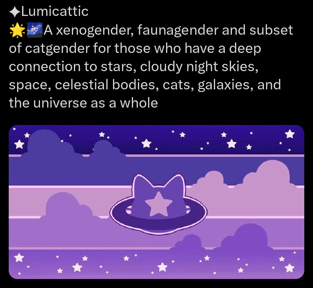 Hey there! My name is Alice but I'm known on the internet as SUAddict (Steven Universe Addict) or Addict for short, alternately I'm also known as YepTheEmo. I'm 18 years old, My pronouns are She/They, I am a lumicattic (definition below) demigirl and I have autism. My favorite things to do are draw, play video games (any platform really. Even VR), play ukulele, and sing! My biggest inspirations are The Boys (Your Narrator, EddieVR, JuicyFruitSnacks [I met him!!], JoshDub, and Mully) and SomeThingElseYT. I also do animation on youtube sometimes. My entire aesthetic is galaxy (as you can tell from the theme of this carrd) and my favorite color is purple. That's about it from me and I hope you can find the time to subscribe on youtube and chat with me on discord!